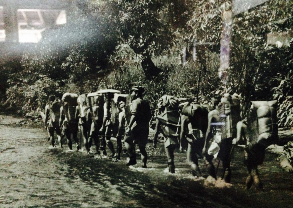 • and a caravan of porters carrying supplies through jungle streams, reminiscent of the long treks between settlements like Marudi, Long Lama, and Long Sobeng.